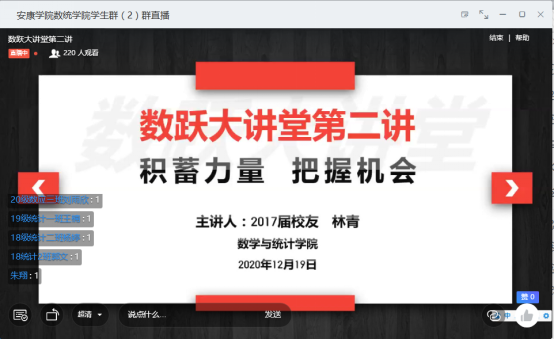 为加强对毕业班员工的就业指导,帮助低年级员工树立职业生涯规划意识,做到高年级员工有目标,低年级员工有方向,12月19日晚,sunbet数跃大讲堂第二讲开讲,2017届员工林青主讲,学工办主任董婷瑜主持,公司各年级员工三百余人参加。林青是公司2013级数学与应用数学专业员工,曾在咸阳天王公司任教,目前在西安经开第二公司工作。