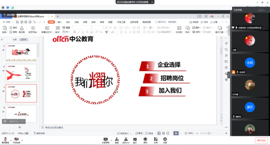 北京中公教育科技有限公司陕西分公司方贤军介绍了公司的发展历程、业务范围、荣誉资质,中公教育目前已覆盖31个省份、391个地市,是一家综合性职业教育企业,并于2019年成功上市。最后方老师对招聘岗位的岗位职责和任职资格、应聘流程、薪资待遇等一一做了讲解。
