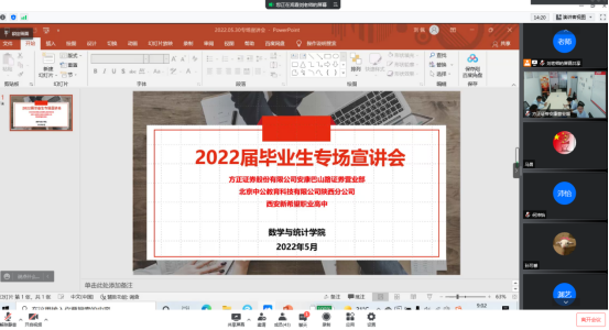 为落实国家“六保六稳”政策精神,促进公司2022届毕业生充分就业,2022年5月28日上午,公司举办方正证券股份有限公司安康巴山路证券营业部、北京中公教育科技有限公司陕西分公司、西安新希望职业高中专场宣讲会,公司毕业班80余名员工参加了宣讲,会议由毕业班辅导员刘佩主持。
