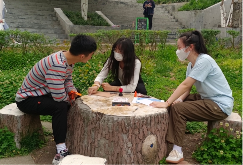 “寻宝人”各自抽取一张挂有彩带的明信片到指定地点寻找属于他们自己的彩带。怀揣着期待之情,同学们纷纷来到花园或树林中寻彩带,大家反应迅速,飞快地奔向树林中取下对应彩带。他们的身影穿梭在校园中,愉快地进行着寻宝之旅。在此次寻宝角逐中,一个彩带对应着一个任务,如给母亲打电话,表演母亲喜怒哀乐的样子等。