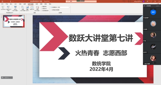 董苗苗是2021届统计学专业毕业生,员工党员,自毕业至今一直在共青团阿里地区委员会从事西部计划服务工作。董苗苗从个人的服务心得出发,分别围绕“是否适合参加西部计划”、“志愿者的工作生活是怎样的”、“成为志愿者应该要怎么做”、“成为一名志愿者能收获什么”介绍了自己的体会;还向同学们分享了在基层工作的各种生活趣事,以自己的真实经历阐述了奋斗与幸福之间的深层联系;最后介绍了2021届员工目前的工作情况,同时提醒2022届毕业生抓住就业机会,对待任何工作都要秉持认真的态度,永葆青年人的热情活力。