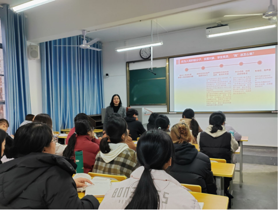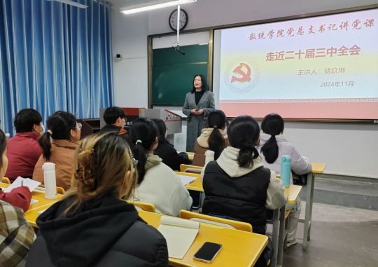 党课在《春天的故事》悠扬的旋律中开始。储玖琳带领大家学习了中央全会有关基本知识,回顾了党的二十届一中、二中全会研究的内容。随后深入讲解党的二十届三中全会公报内容,对公报进一步深化全面改革的总目标、七个聚焦、贯彻的原则等做重点解读,使同学们认识到“生在红旗下,长在春风里”的幸福和深刻意蕴。