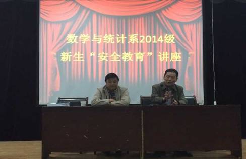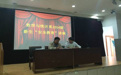 2014年10月24日下午,数统系在1号教学楼六楼报告厅召开了2014级新生“安全教育”讲座。保卫处副处长王开忠、科长王登文、数统系安全联络员王波,系党总支书记郭全寿、学工办主任马新华,辅导员张远秀以及2014级全体新生参加了活动。活动由马新华主持。