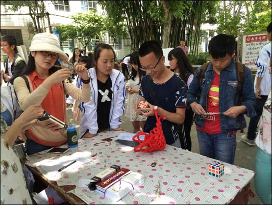 游园活动设置的游戏项目均与数学相关,以趣味为重,内容丰富,形式多样。项目有数独游戏、魔方竞技、九连环竞技和速解奥数题等,吸引了众多同学参加。特别是魔方与九连环竞技,激起了许多同学的兴趣,看着手中的魔方,通过各种转换旋转,最终完成变换,同学们脸上洋溢着开心的笑容;九连环,上掏下拉,不断变换,看得周围同学赞叹不已;参加数独游戏与速解奥数题也不甘示弱,仔细思考、认真计算,解出答案者甚至情不自禁地跳了起来,活动现场热闹非凡。参与的同学拿到各种奖品之时,热情更加高涨。