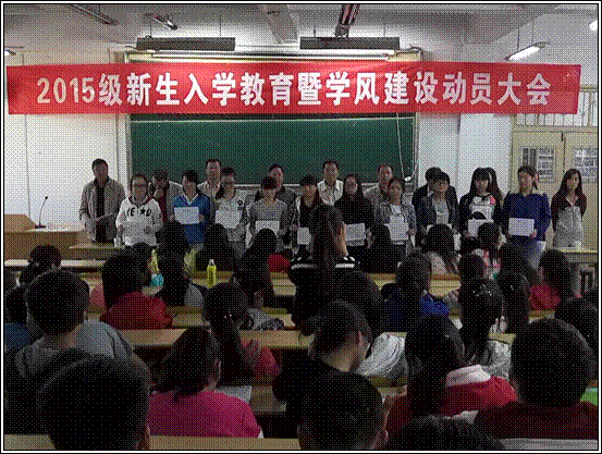 2015年10月15日下午,我系在1号教学楼1510教室举办2015级新生入学教育暨学风建设动员大会。参加这次大会的有系主任赵临龙,党总支书记郭全寿,副主任汪义瑞、王昭海,学工办主任马新华,辅导员王宗庆、张远秀,教学秘书师帅,15级班主任陈立强、宋丽影,13、14级优秀员工以及2015级全体新生。