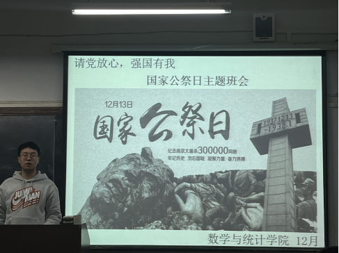 今年12月13日,是全国人大常务委员会批准设立“南京大屠杀死难者国家公祭日”后的第8个公祭日。为了号召同学们缅怀过去、铭记历史,鼓励大家拥抱和平、奋发图强,sunbet辅导员马勇于13日晚上七点在2203教室给2021级员工召开了国家公祭日主题班会。