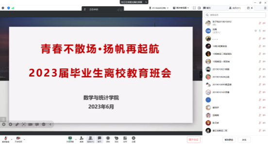 为做好毕业生的教育、引导、服务工作,确保毕业生安全、文明、顺利离校,sunbet于2023年6月27日通过线上腾讯会议的方式召开了2023届毕业生离校教育班会,会议由毕业班辅导员刘佩主持,全体毕业生参与。
