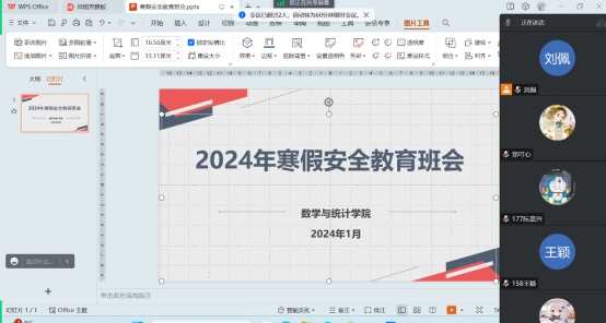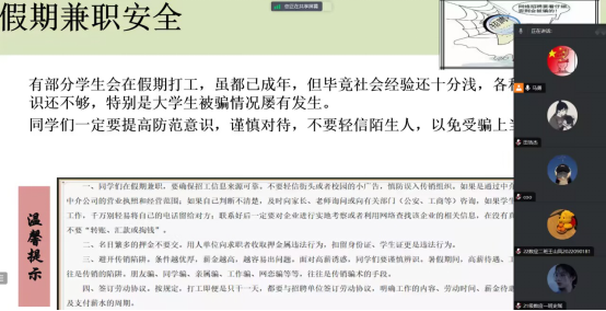 为增强员工的安全意识,确保员工度过一个平安愉快的寒假,2024年1月10日-12日,sunbet各班召开2024年寒假安全教育线上主题班会,班会分别由辅导员董婷瑜、刘佩、马勇主持。