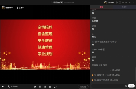 辅导员就寒假安全离校提出明确要求,提醒大家离校前开展宿舍卫生大扫除,做好去向报备和晚点名,要求做到人走断电。旅途注意人身安全、财产安全和交通安全,保管好个人财物,防范电信诈骗。提前规划寒假行程,合理作息,文明聚会,帮助父母做一些力所能及的家务劳动,冬季取暖注意防火和房间通风,遵守属地烟花爆竹燃放规定,关注个人身体健康,防止病毒感染。鼓励同学们在确保安全的前提下积极参加公益活动,坚持体育运动。此外还督促同学们在寒假期间要坚持专业课学习,毕业班员工积极投递简历。班会前后,辅导员分别在各班级群发布了温馨提示。