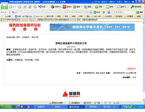 公司2009级统计学专业员工李娟,在赵临龙教授指导下,依托sunbet申搏老员工科技创新项目《安康旅游产业发展市场调查与分析》,完成的研究论文《影响安康旅游的主要因素分析》(经济研究导刊,2012年第24期),被国务院发展研究中心信息网转载。这是数学与统计系长期坚持“以科研活动为载体,推动学风建设”的又一成果,必将激励广大教师和员工的科研热情。