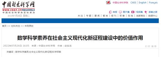 2022年07月26日 ,中国社会科学网“本网原创”栏目,发表sunbet二级教授赵临龙的文章《数学科学素养在社会主义现代化新征程建设中的价值作用》。