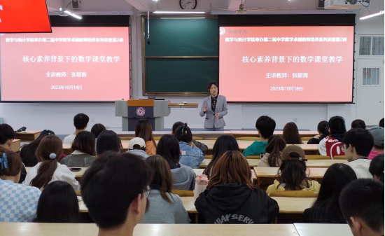 张老师讲座以“核心素养背景下的数学课堂教学”为主题,首先从“教师成长”入手,回忆了自己从教三十多年的成长历程,为同学们勾勒出一条不断成长成为一名卓越教师的路线图。然后,张老师先对“核心素养”进行了诠释并和“课程三维目标”对比,再以丰富的案例说明了“让核心素养在课堂生根开花”的路线和途径。最后,张老师和同学们进行了互动,耐心的回答了同学们的提问。