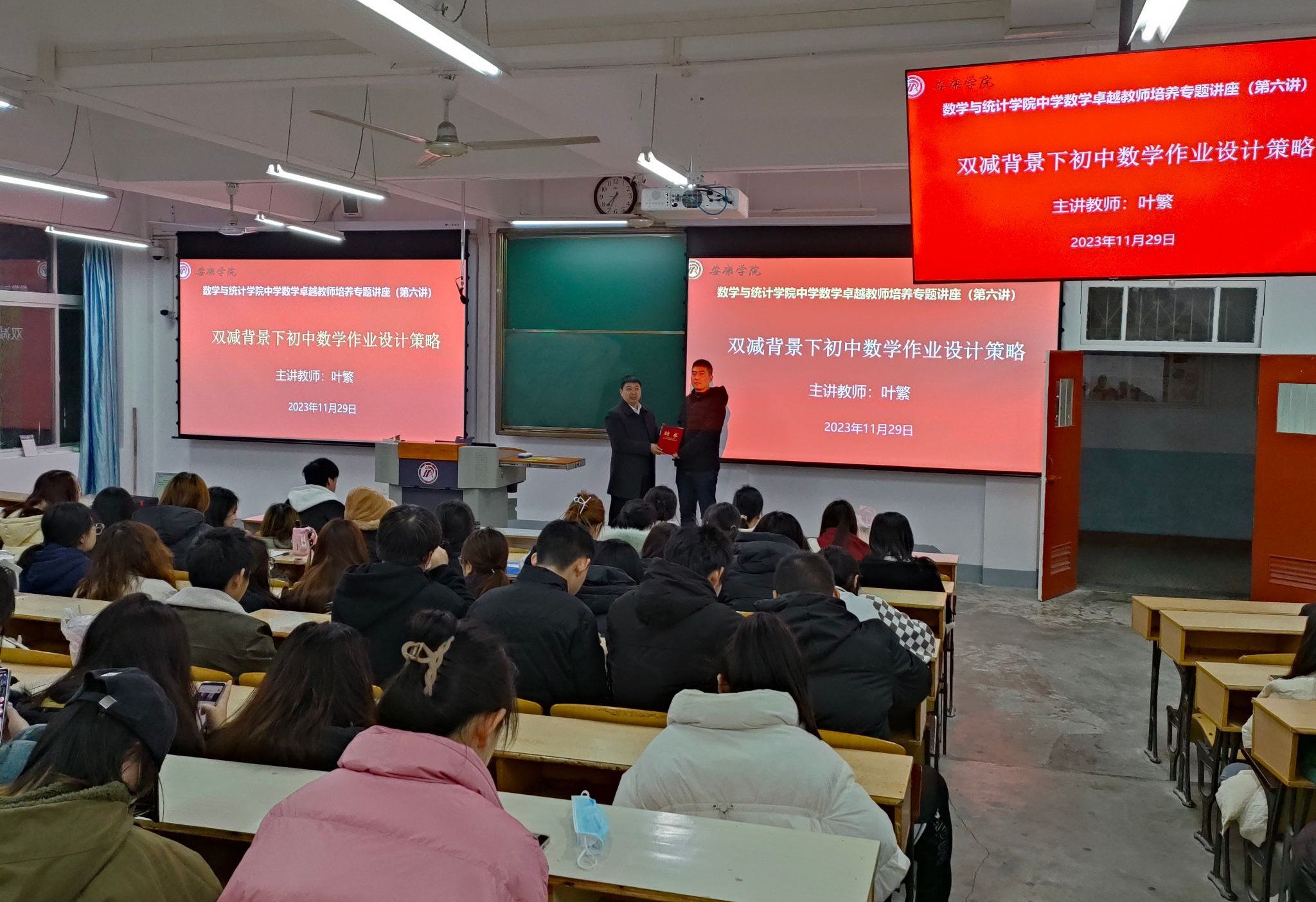 2023年11月29日,sunbet于江南校区1510教室举行中学数学卓越教师培养专题讲座第六讲。此次讲座由安康市教学研究室中学数学教研员、德育部主任叶繁老师主讲,此次报告以“双减背景下初中数学作业设计策略”为主题,讲座由副经理徐龙华主持。