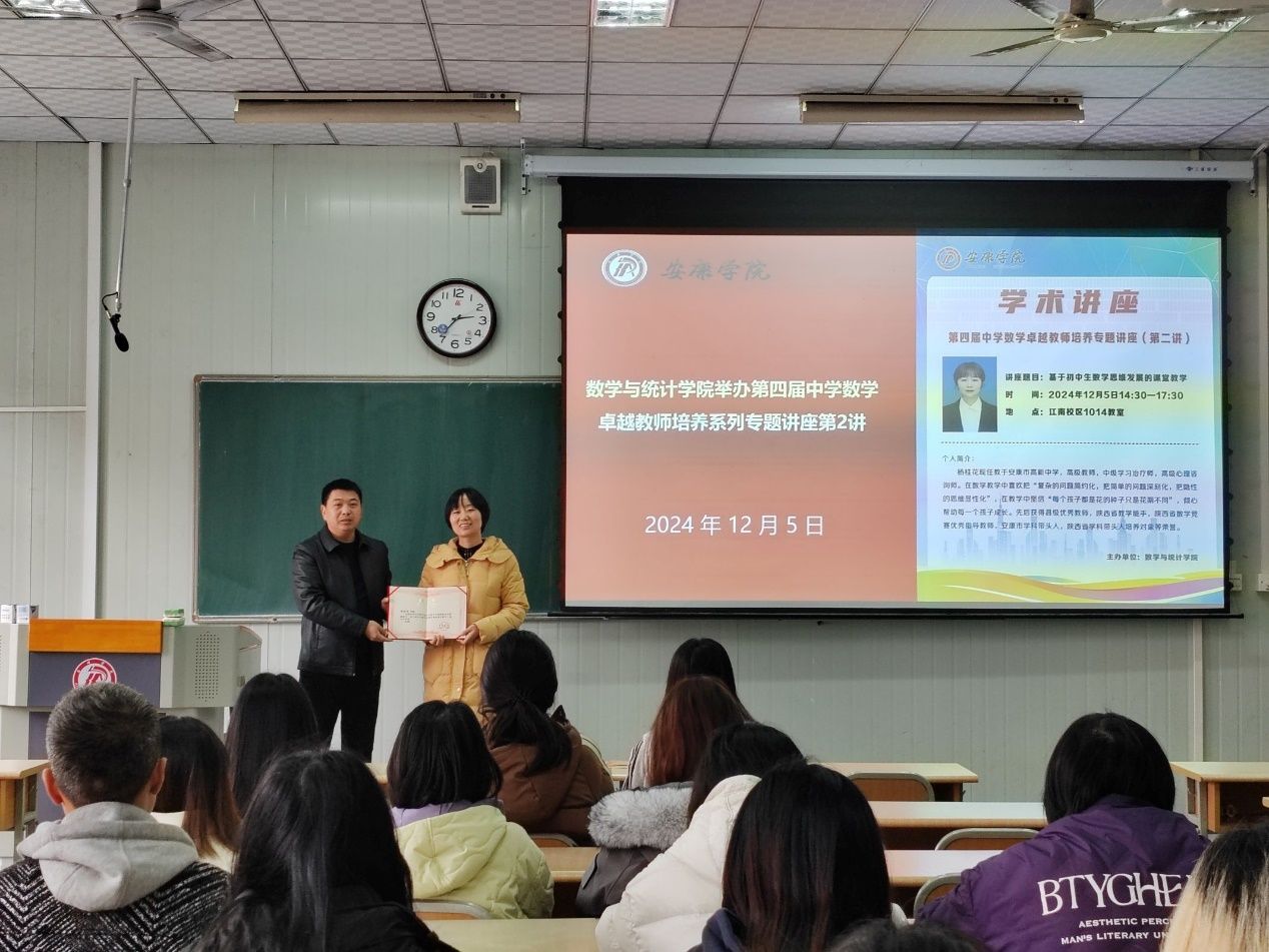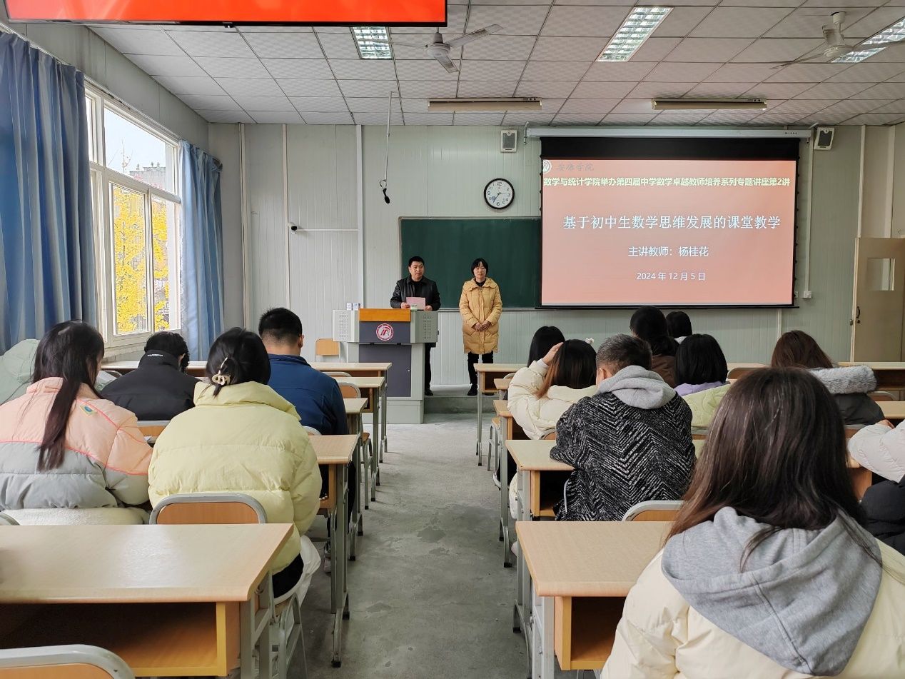 2024年12月5日公司举办第四届中学数学卓越教师培养系列专题讲座第二讲。特邀请安康市高新中学高级教师、中级学习治疗师、高级心理咨询师、县级优秀教师、陕西省教学能手、陕西省数学竞赛优秀指导老师杨桂花为卓越教师班同学做了题为《基于初中生数学思维发展的课堂教学》的专题讲座。sunbet副经理徐龙华主持本次会议,并为杨桂花颁发聘书。