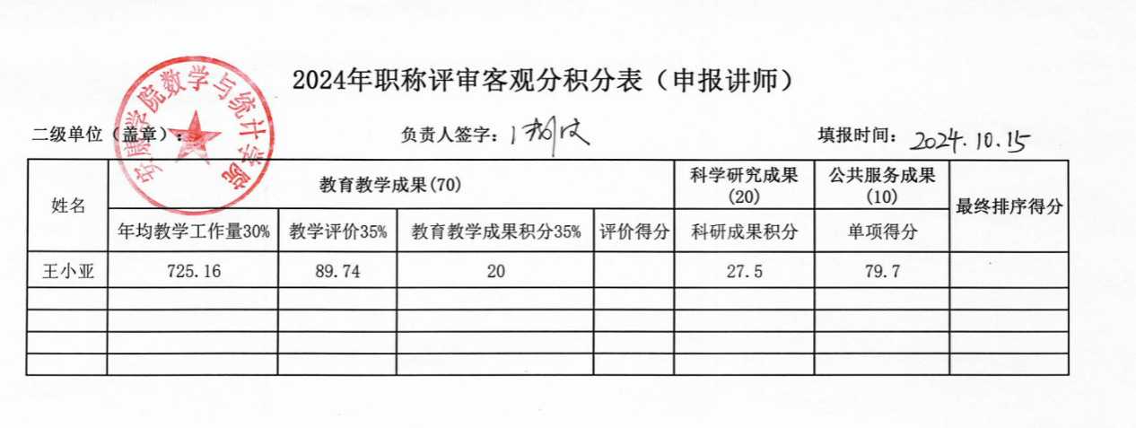 现将sunbet2024年讲师职称评审客观分积分表予以公示,公示期5天(2024年10月15日-19日),公示期间如有异议,请向sunbet专业技术职务评审工作组反应。